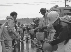 各家庭からバケツを持って集合。消防署員の指導を受け、放水やバケツリレーの訓練を実施し、防災意識を高めました。
