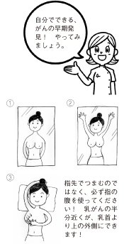 乳がんは“自分自身で発見できる”数少ないがんの一つです。乳がん検診と併用して、月に一度の自己検診によるチェックを行うことは、早期乳がんの発見にもつながります。自己検診で乳房に変化を感じた場合は、次回の乳がん検診を待たずに、直ちに医療機関を受診してください。自己検診の方法は下記をご覧ください。
