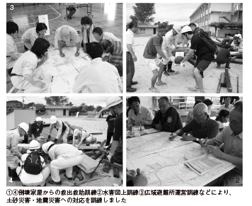 土砂災害防止活動(水防工法)、避難所運営訓練(HUG)、水害図上訓練(RIDIG)、応急炊飯訓練など、市民参加による学習体験型の訓練が多く盛り込まれ、市全体の防災力の向上につながる一日となりました。