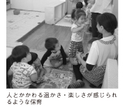 市内の園では0歳児から5歳児までの子どもたちが集団生活をしています。家族以外の人と初めて関わって生活をする園では、「人とかかわる温かさ・楽しさ」が感じられるように保育をしています。