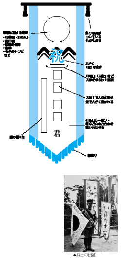出征幟は、入隊が決まった若者の家の周囲に立てられ、どこの誰が入隊するか地域の人びとに情報を伝える一種のメディアとして機能しました。また、神社などで行われた戦勝祈願のセレモニーや駅まで若者を見送るパレードでも、打ち振られる「日の丸」の小旗とともに欠かせない小道具となりました。