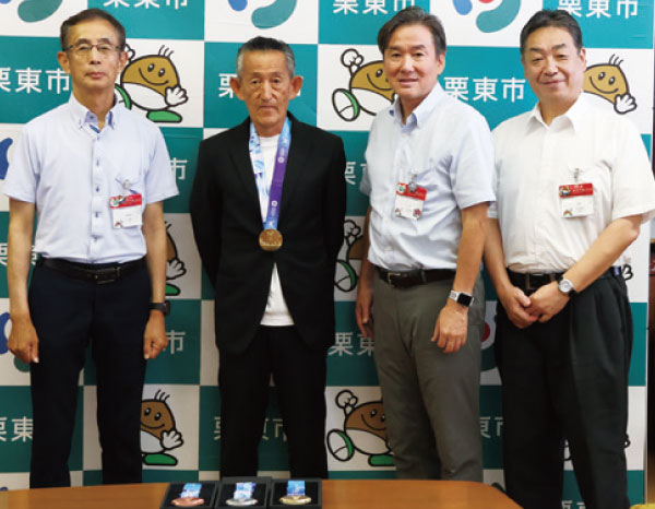 今年5月に開催された生涯スポーツの世界大会「ワールドマスターズゲームズ」に出場した本市在住の曽野政男さん。陸上の中長距離4種目で金メダル2個と銀・銅メダル各1個を獲得するという快挙を成し遂げ、市長を表敬訪問しました。