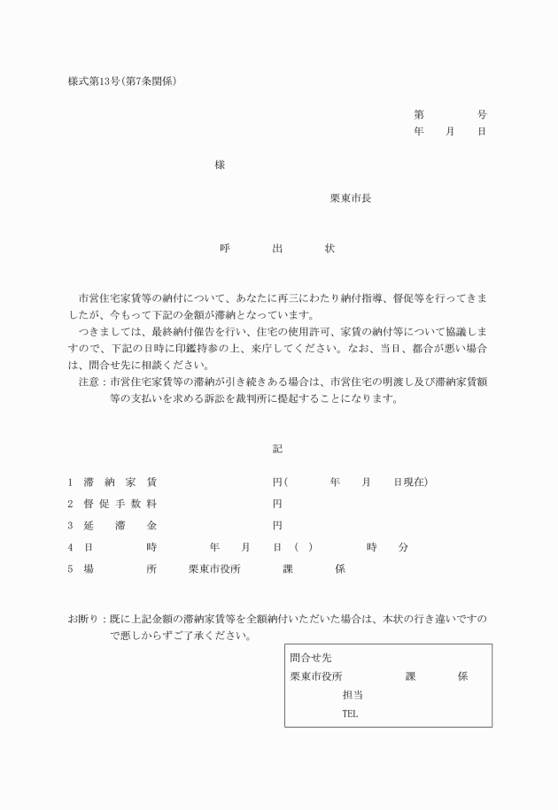 第9条 市長は、最終催告にも応じない滞納者に対して、当該住宅の明渡期限(以下「明渡期限」という。)を指定して条件付使用許可取消書(以下「明渡請求書」という。)を送付するとともに、当該滞納者の緊急連絡先に対しては、滞納家賃等指導依頼(別記様式第15号)により滞納者に対する納付等の指導を依頼する。