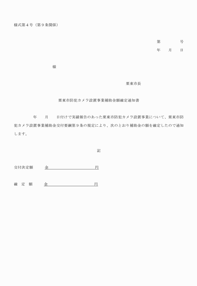第8条 自治会等の代表者は、補助対象事業が完了したときは速やかに栗東市防犯カメラ設置事業補助金実績報告書(別記様式第3号)に次に掲げる書類を添えて、市長に提出しなければならない。