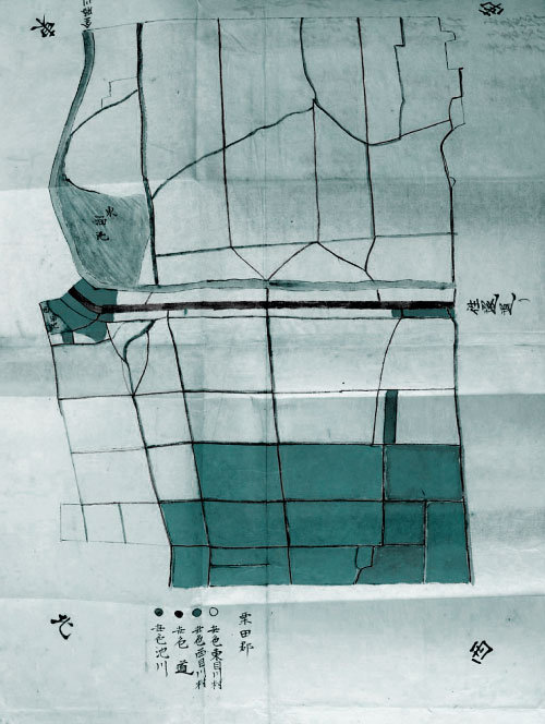 このように、東目川村と西目川村の境界については、これまではっきりとしたことは分かっていませんでした。しかし、栗東歴史民俗博物館で開催中の小地域展「目川の歴史と文化」に向けた資料調査で、両村が合併する直前に描かれた絵図が、滋賀県立公文書館に残されていることが明らかとなりました。その絵図には、東海道の両端(坊袋・岡それぞれとの境界付近)と、小柿と接する付近の田地が、西目川村の範囲として示されています。