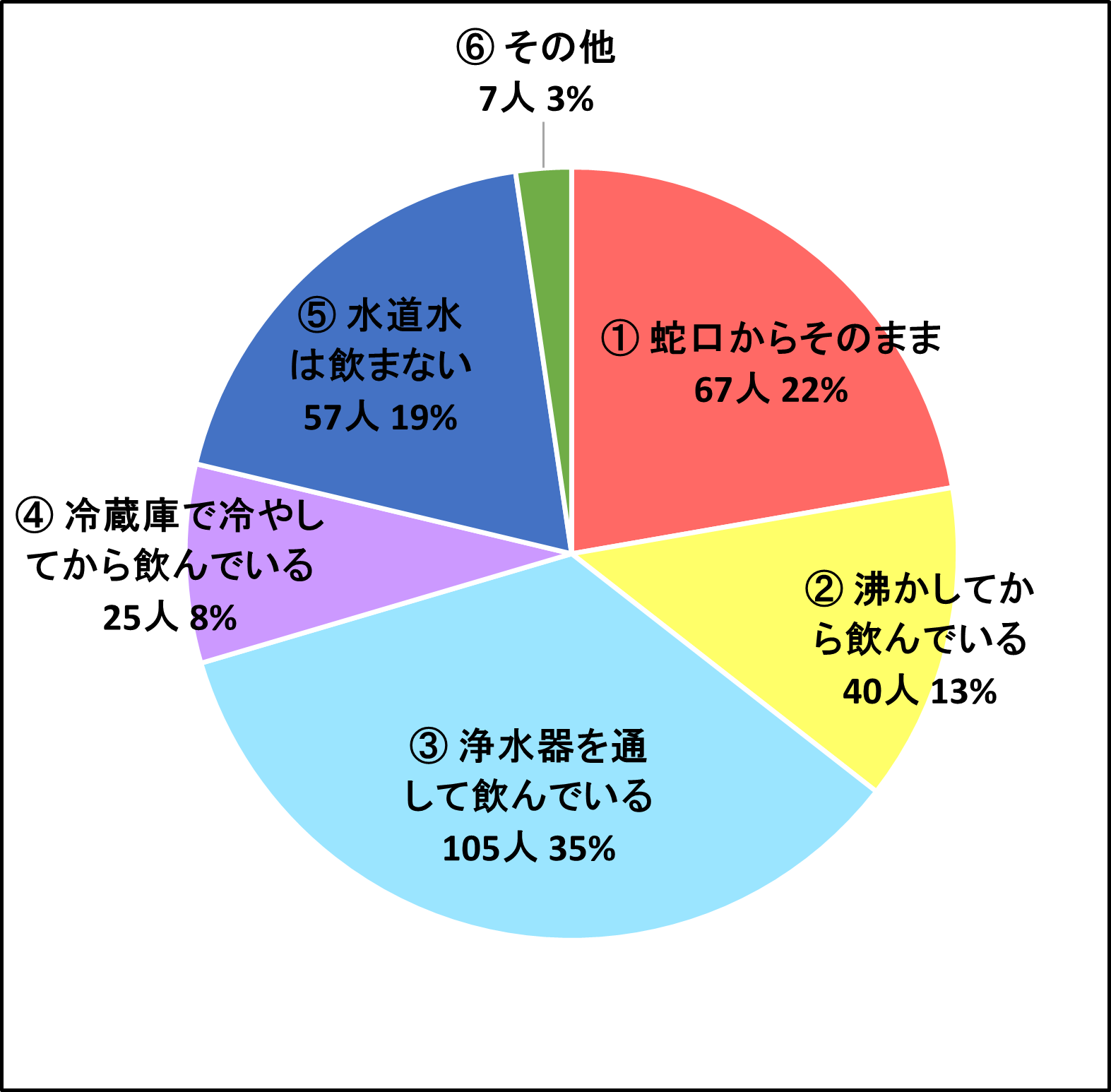 ・「水道水の安全性(水質)に不安があるから」という理由で、水道水を直接飲まないと回答された方に対しては、水道水はミネラルウォーターよりも多くの検査項目をクリアしており、安全性には全く問題がないことをお伝えさせていただきました。