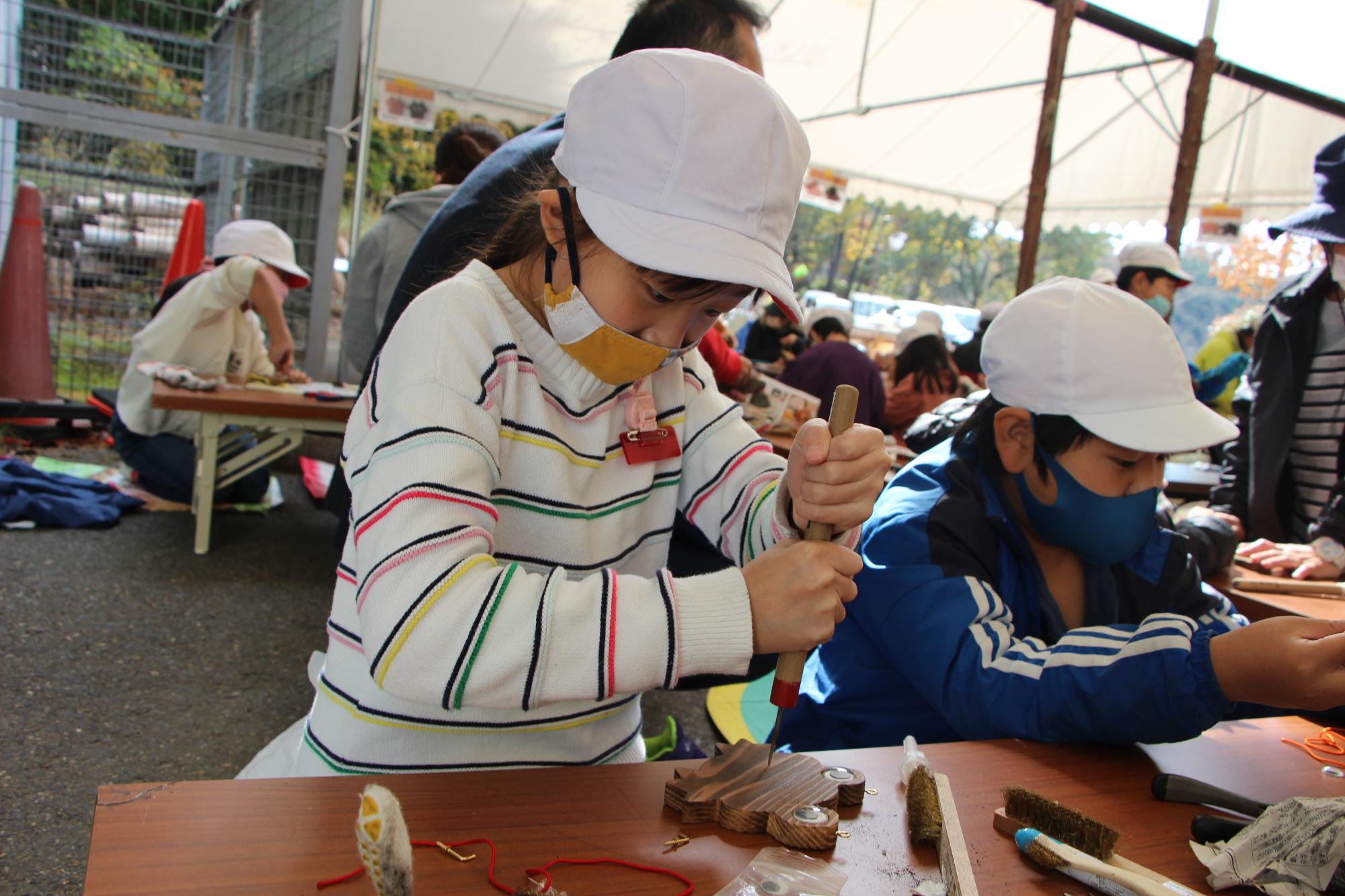 うさぎやカエルなど好きな動物の柄を選んだ後に、地域サポーターがバーナーで焼き目を入れてくれます。子どもたちは、動物の目を接着剤で付けたり、フックを吊るすための穴をあけていき、思い出の作品を作り上げました。