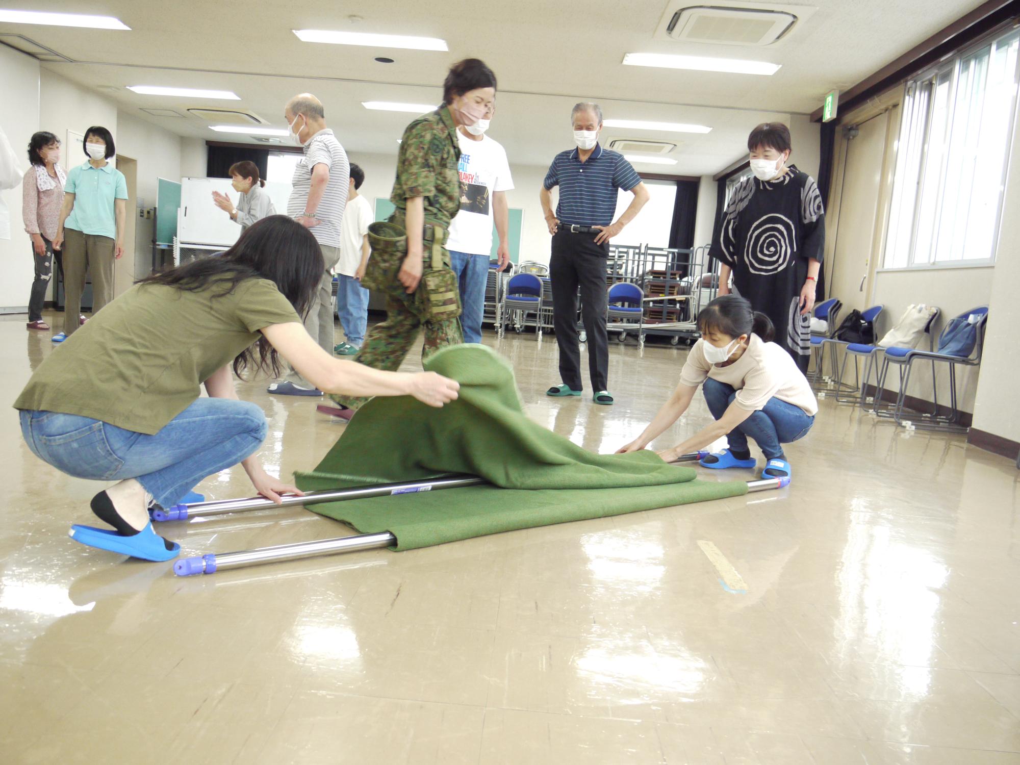 手当てをし、少しでも安全な場所に移動する方法を、自衛隊滋賀地方協力本部の皆さんから学びました。