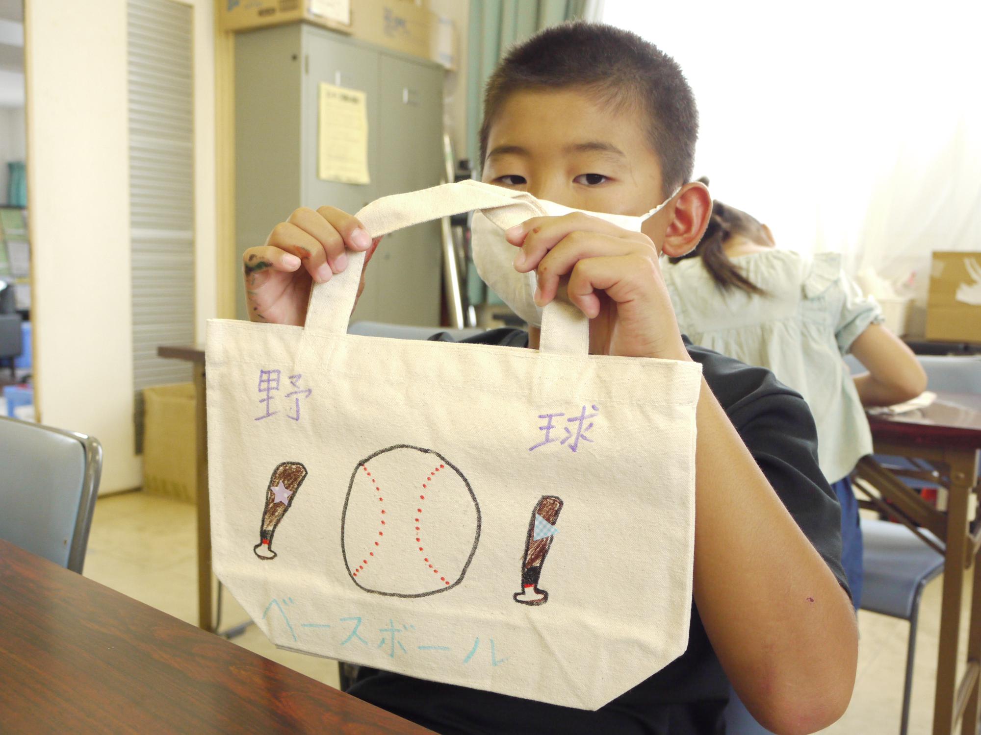 扇風機で乾かしながら、「何いれよっかなぁ」「絵は違うけど、みんなお揃いのバッグで嬉しい」とお互いの力作を見せ合い、完成を喜んでいました。