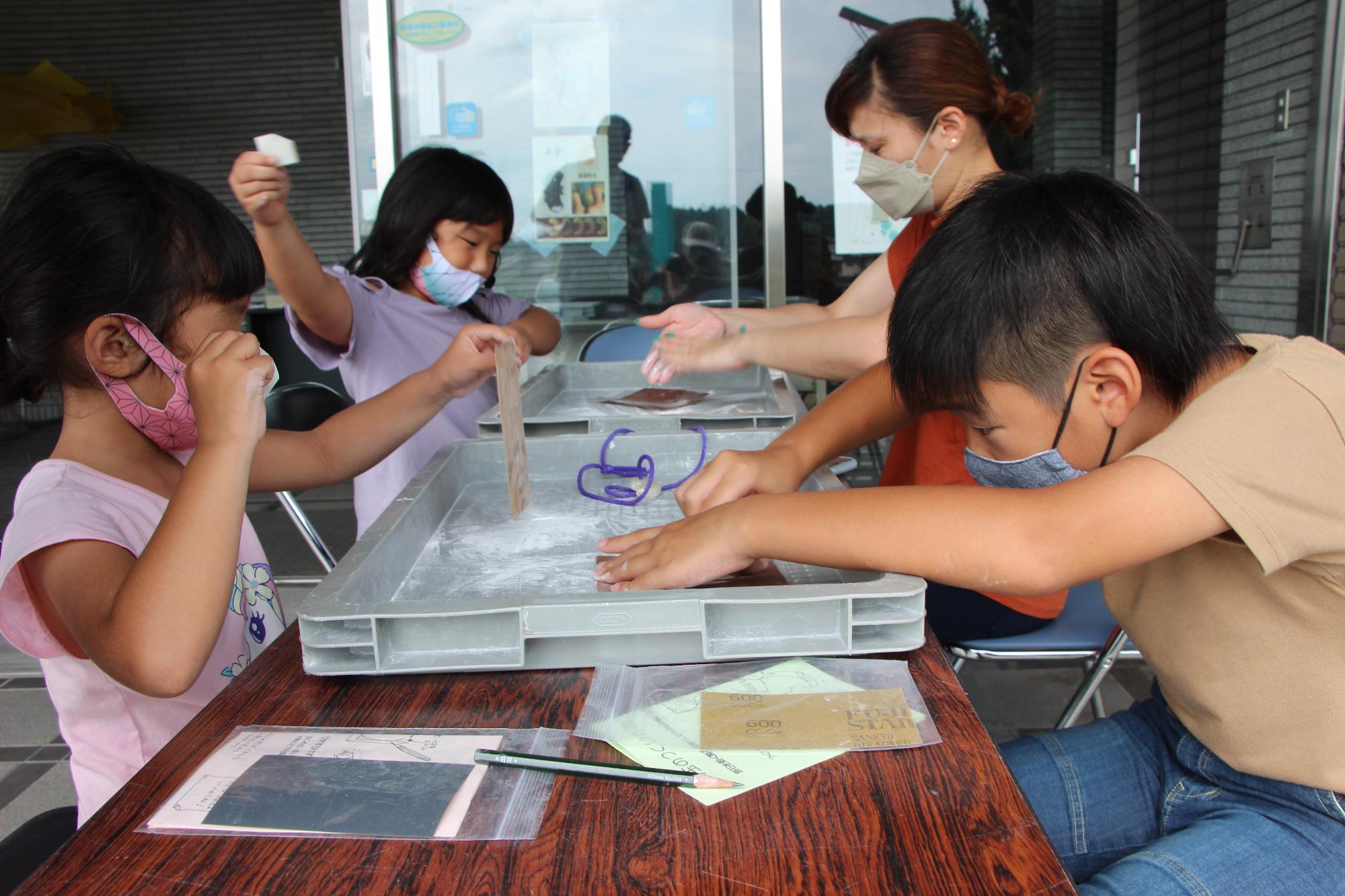 センター正面入り口の「勾玉をつくろう」コーナーでは、26人の子どもたちが参加。