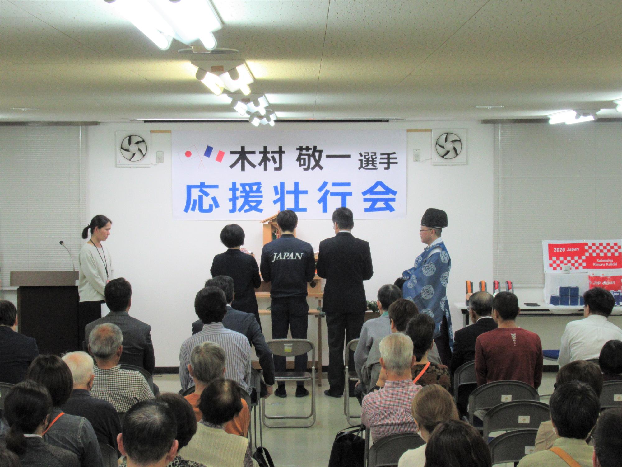 祝詞奏上の後、木村選手が神前に玉串を捧げ、全員で活躍を祈願。