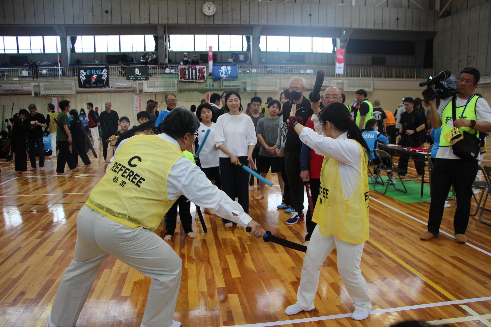 競技役員から、「基本動作」と呼ばれる5つの型を教わり、実践。相手の攻撃を避けながら剣を振りぬき、相手を打つと、爽快感があるといいます。始めは遠慮がちに剣を振る体験者も、回数を重ねるごとに、相手に向かって思い切り振りぬけるようになりました。
